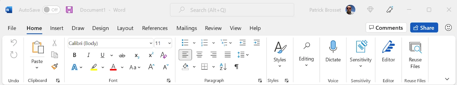 Microsoft Word uses the available title bar space to display the auto-save and search functionalities, and more.