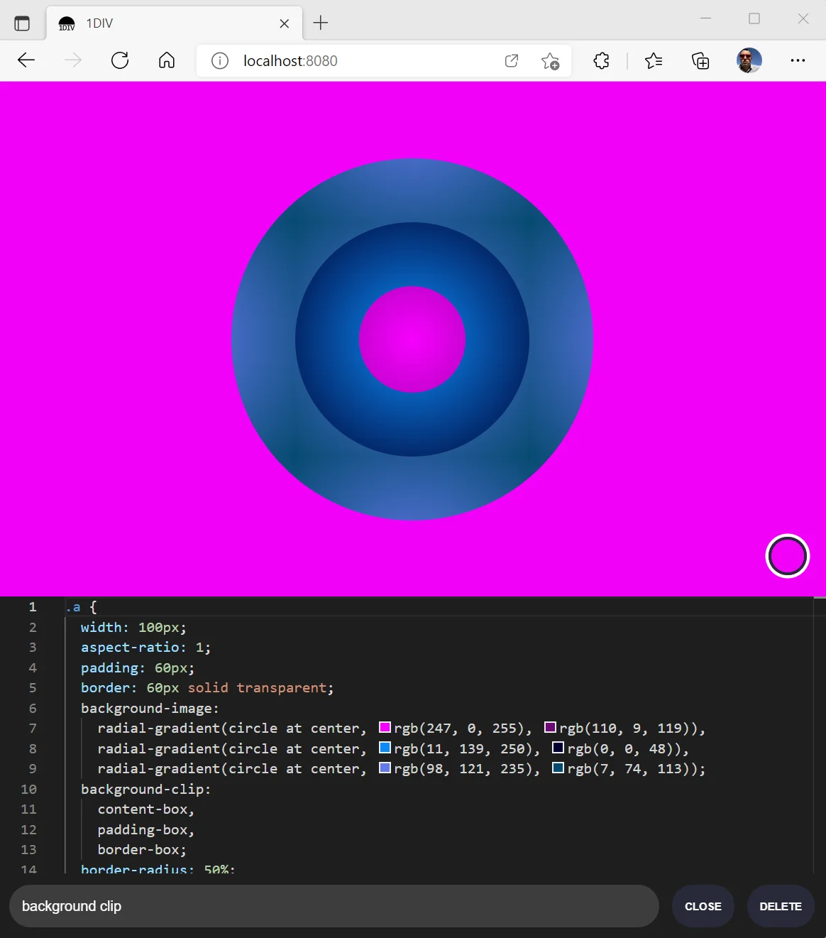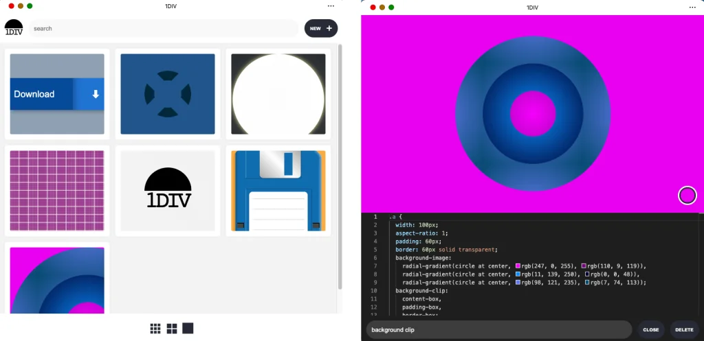 The demo app is called 1DIV. It’s a simple CSS playground where users can create designs using CSS and a single HTML element.